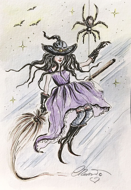 Days #29 and #30 – I had to catchup a day so I decided to combine two days using four promps in one drawing! Prompts are: Broom Ride, United, Spider, Found 🖤Today I wrote a short story for this painting! “Gilda the mysterious witch in a night during Fall, was seen in the sky at night, she was fast riding her broom happily, after she got reunited with her found friend Spider!” ©CR 🖤♥️