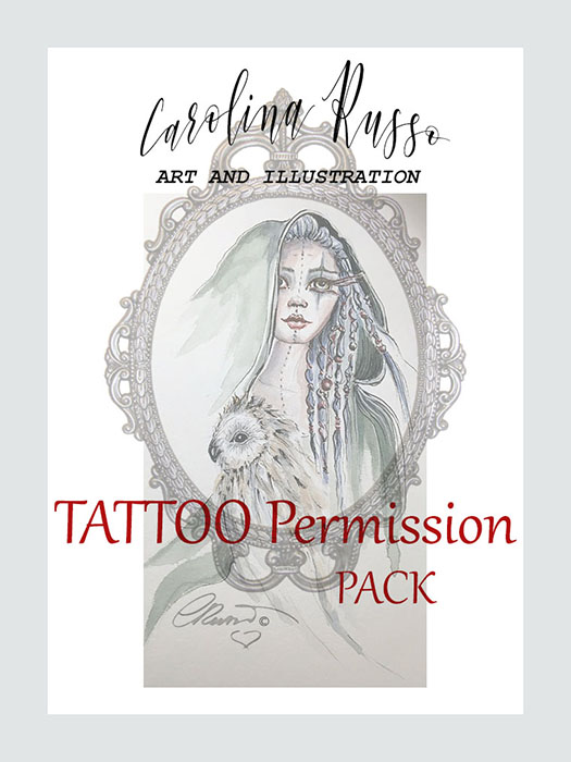 Lately I have received an increased number of requests from people that like my art asking permission to use my artworks for a tattoo. I am happy that people like my Art as much to decide to have it permanently inked somewhere on their body. I consider this request a great and wonderful honor, I am thrilled and humbled that someone is thinking to use my existing paintings or illustrations for their tattoos! Well, as visual artist this open another window into my art. I love tattoos and this is the opportunity with this post to inform and talk about a few important things. What to do with a request like this? If you’re an artist, or, if you are the person interested to get the tattoo. There is something very important to be aware of, and is that people cannot just save an image of an artwork over the internet and take it to the Tattoo Shop to have it tattooed. Some Tattoo artists only works on their own custom creations and most of all they do not copy another tattoo artist work. They are a bit more open when you bring your favorite visual artist work to be recreated having the permission from the artist. So, what to do then? There is a mutual respect of the Copyright between a tattoo artist and a visual artist, no one wants to do a “Copyright Infringement” while recreating without permission an existing artwork that is not custom created by the tattoo artist you choose but created by another artist. Then, not everyone knows that if you’re going to bring your favorite artist artwork to have it tattooed it’s needed the artist “Permission”. All you need to do is to obtain your permission in advance, by contacting directly the artist, or find out if he/she sell a Tattoo Pass/Ticket on their website or shop. What is a Tattoo Pass or Tattoo Ticket? Artists sell the permission letter to use their artwork as tattoo often nothing is shipped and they send a downloadable PDF for you to print. When you purchase the Pass or Ticket, it’s your kind way to pay and support the artist work and art.