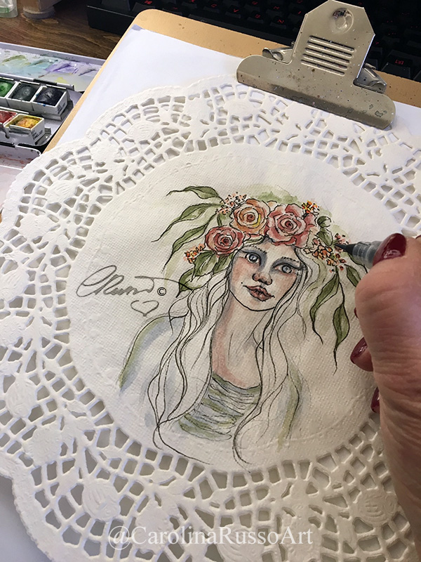 I painted in my traditional signature style in watercolor and ink but this time not on the usual watercolor paper. I came across this 10 inches diameter paper lace doily at home and my first thought was to make a ink drawing on it! I love to explore new artistic and creative ways to paint, testing papers or surfaces and see how watercolor works especially on unusual ones! I am always driven to try new techniques and materials. I have to say that the combination of watercolor and ink pen did work really well without any bleeding through the paper! I am happy and pleased with the outcome! The watercolor looks great on this paper doily, the original painting is lovely and would look great with a floating frame. I will sure create more paintings on paper doilies in the future.