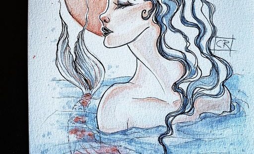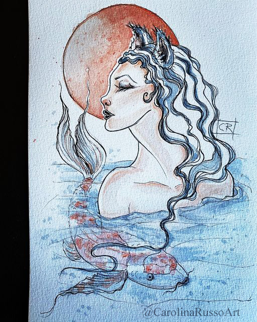 For today drawing I had to combine Werewolf and Fish I guess I did it nicely and I am happy with my painting! I am not so much inspired by dark creepy or scary characters so I try to make them look less scary and more nice :-). I have created my Werewolf in a lovely female form taking a bath at the full moon light enjoying the company of a lovely Koi Fish.