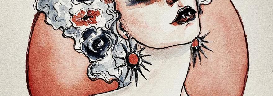 Artist’s details about the painting: .I used a Draft/Matic Pencil 0.5mm by ALVIN for my sketch. I painted on a 10 inch Paper Doily, I used French Artists Watercolor by Sennelier l’Aguarelle. Ink pen COPIC Multiliner #01 and a SAKURA White Gelly Roll pen.