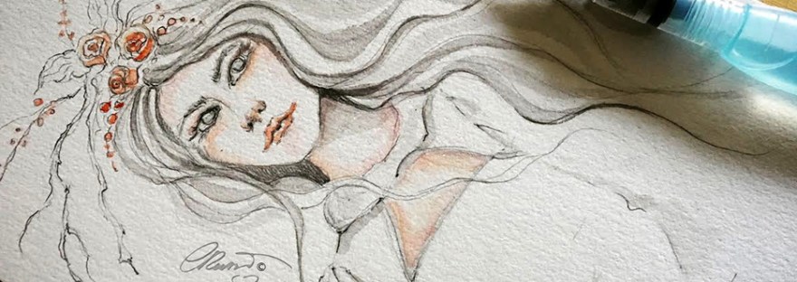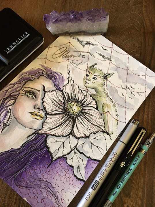 My watercolors usually are outlined with black and white ink pens. I used French Artists Watercolors Sennelier l’Aguarelle, Ink pens used COPIC Multiliner Black ink #03 and 05 . A Alvin Draft/Matic #03 Limited Edition Pink Mab Graves Pencil. Pentel Aqua Brush – I painted on Bee Paper for watercolor 140lb, 100% cotton, cold pressed, size 6×9 inches .