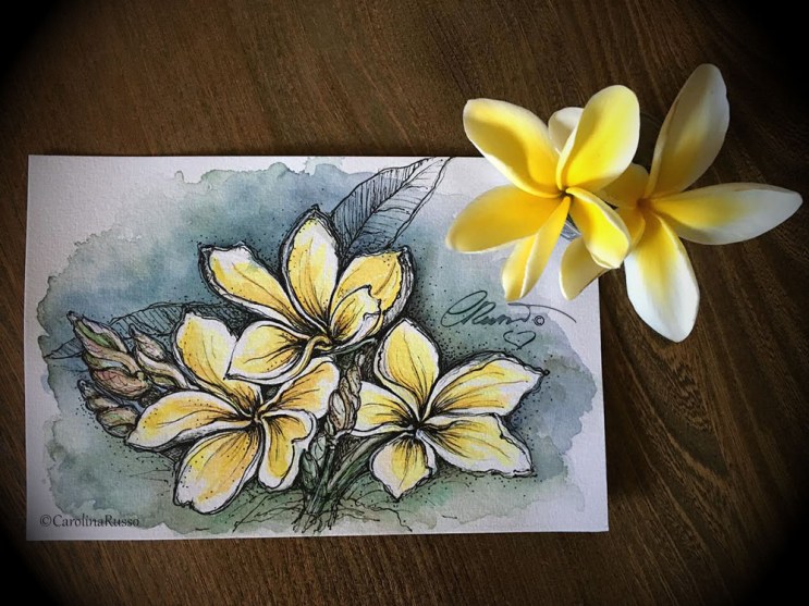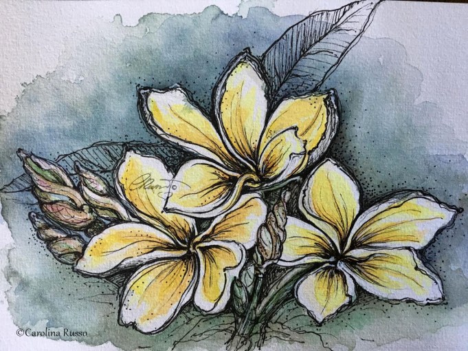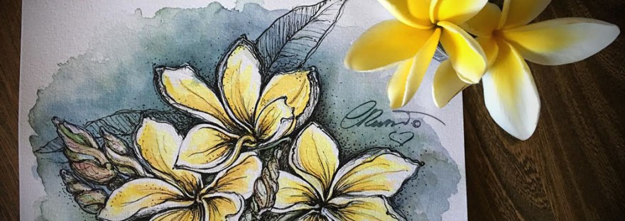 Today I am happy to post my just finished “Plumeria Flowers” watercolor painting! I loved to create this piece in one of my signature styles: Watercolor and Ink.
