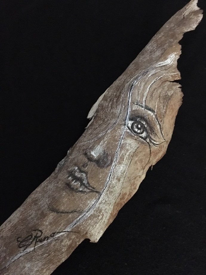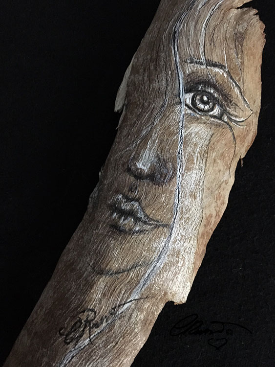 What turned out is a mysterious face and ethereal portrait, created with only a black and a white Ink pens. I loved and enjoyed drawing this piece very much. Following the natural grain of the wood and letting the curves lead my drawing allowing this face to come alive and out to us. It is a one of a kind piece, I don’t have a title yet but you all can help me to find one, you can tell me in the comments what do you see in her expression? What she is telling you? Your help is very much appreciated and together we can find a title for her.