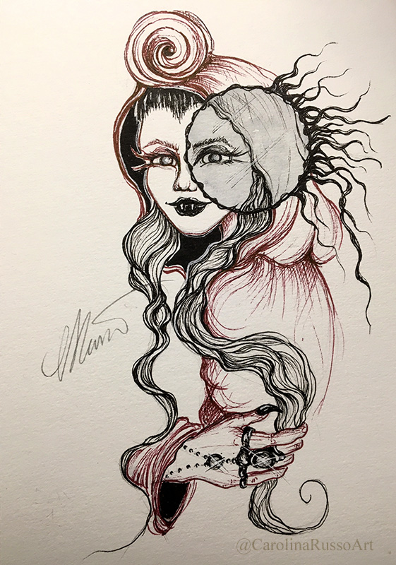 Today my Vampire drawing is mostly created in red and black inks only a little splash of watercolor. This month you will see more dark themed art in my drawings cause the “mabsdrawlloweenclub challenge has prompts inspired by darkness and Halloween theme. It’s always interesting to see the way I can adapt my style! Each year I give myself a goal about what I want to experiment or work on during this month, last year was “Textures”, this year would be mostly “Inks and toned color papers” you will see a variety of interesting drawings. I hope you like my vision of Vampire she is not as bloody and violent as traditional vampires. To complete the drawing I have created a quote and is: I see the light through the ring of darkness “ – ©️CarolinaRusso