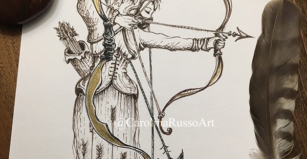 Day 5  drawing took long time to finish it! Sorry I am posting here on the Blog a day late, yesterday I was only able to post it on Instagram! It took me a good time brainstorming to come up with an original idea that will combine the two prompts Build and Huntress nicely and not showing just my huntress building her bows but she carries two bows the bigger one symbolize that she is also a bowyer  a craftsman who makes bows and an huntress in the drawing she is trying out her bows . The fine line work and all the details takes patience and time I am not rushing this series, each drawing has my heart and soul and I want it to be a beautiful series.