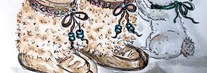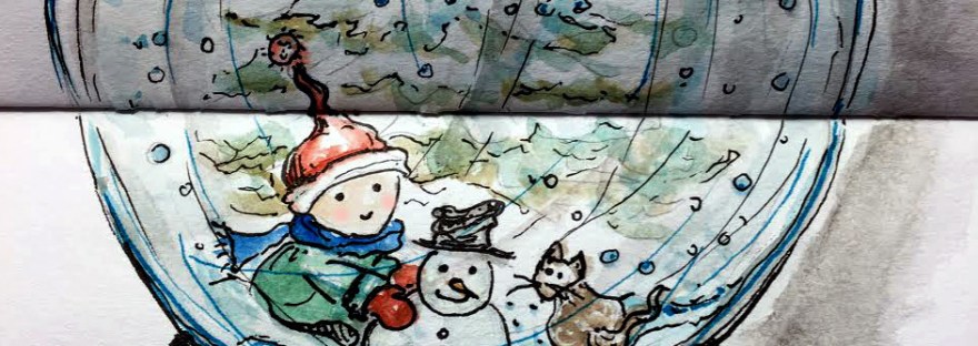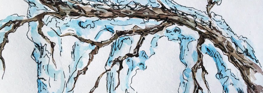 watercolors are outlined with black and white ink pens. I used French Artists Watercolors Sennelier l’Aguarelle 12 demi-godets half-pans travel metal box Ink pens used Pigma Micron Black ink #02, white Uni-ball Signo gel pen and a black ink Pilot Prera fountain pen fine nib . I painted on a small 3.5 x 5.5 inches mixed media sketchbook.