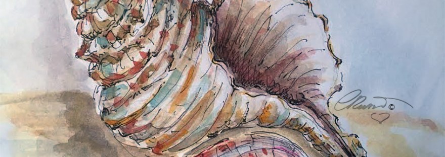 watercolor outlined with black ink pen. I used French Artists Watercolors Sennelier l’Aguarelle 12 demi-godets half-pans travel metal box and Pigma Micron Black ink #05. Painted on watercolor paper Cold Press 140 lb fine grain size 7.5 x 9 inches!