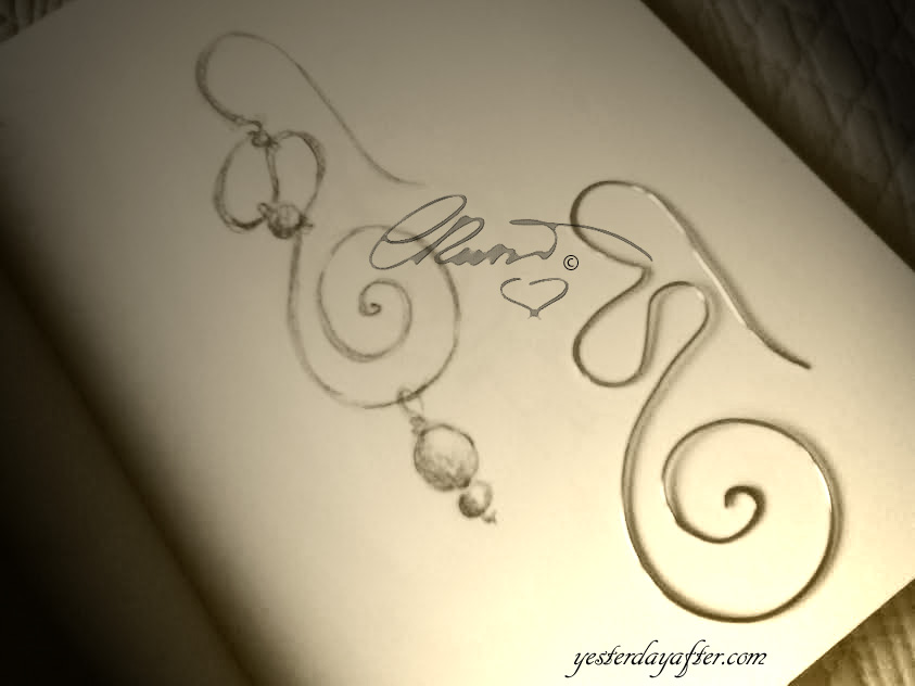 This is my sketch that inspired a half heart shaped earrings, the wire has been forged and hammered to shape perfectly to my drawing. I used a round faceted Pink Quartz stone and a round Mother of Pearl bead and silver.