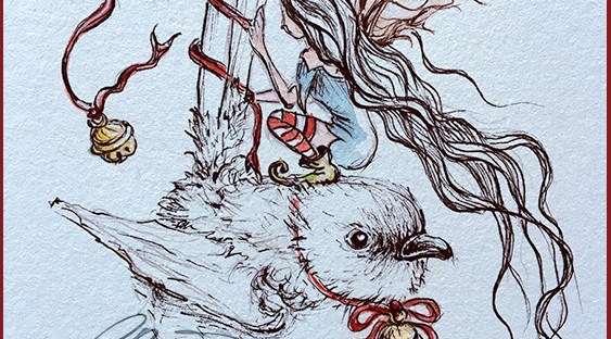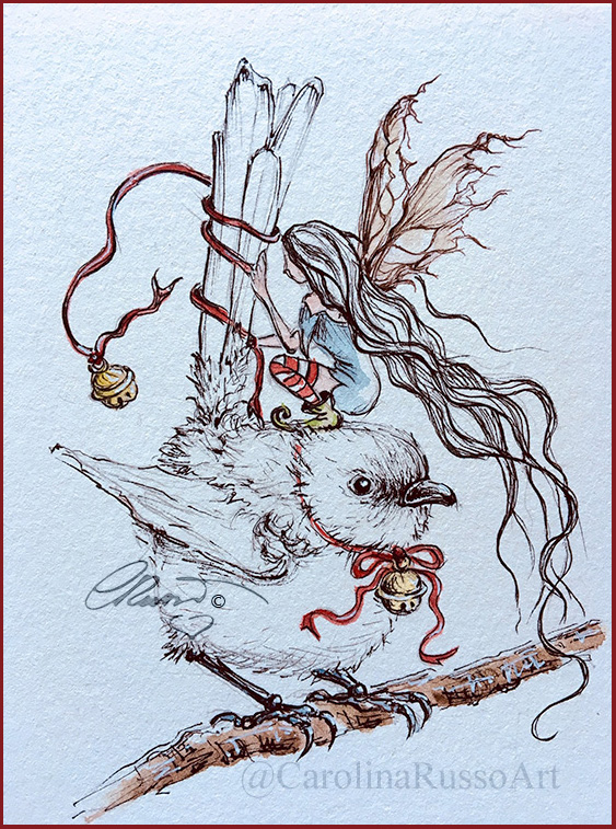 Today I am posting the first painting I was supposed to post it yesterday but I have finished it in my late evening! This start the creation of my new Holidays Art Series! This painting is a little cute wren in company of a lovely fairy, she is decorating him with red ribbon and jingle bells so that when they fly around they will bring the magic sound of Christmas!