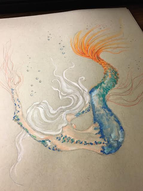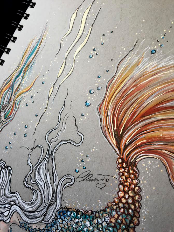 This month of May I have several creative projects going on and one of them is that I am participating whenever possible to the #mermay2017 Challenge. I came across this inspiring challenge following artists friends on Instagram! As you know I love mermaids they are fascinating ,and I have painted several which I have reposted for the first few days of this challenge! Today I am sharing my latest and new Mermaid drawing isn’t finish and still a work in progress. I am already working on stage two “Watercolor”. I am also sharing the pencil sketch that I begin with. This time I decided to do something different and use “Gray Toned Paper” I love toned paper you can create beautiful effects with it! I especially love the white and black ink effect on toned tan and gray paper, but I also like to experiment and I wanted to see how my watercolor style works with this paper. Toned paper is not made for watercolor is a paper for dry media, but it’s not a super thin paper and if you use watercolors you have to find the right balance between color and water, painting more dry than wet. I like it so far and looking forward to see this piece how turn out when I am done! ❤