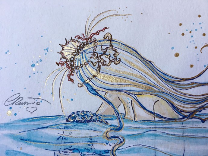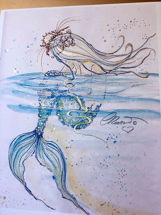 I have ONE print ready of my watercolor painting “Floating Mermaid”and Today I wanted to create something very special for you that love and follow my Art journey! This morning I have been working on it! I have “Hand Embellished” this print with gold ink and I added a new element, the “Crown” to the mermaid, which you don’t find it on the original painting!