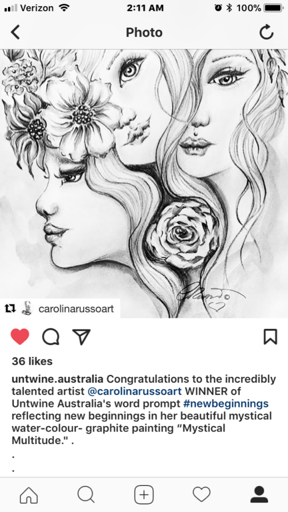 I am so happy and honored to announce that I am one of the six “Winners” chosen by UntwineAustralia participating to their first word prompt Contest for 2018 @untwine.australia #newbeginnings I have participated on Instagram posting my Watercolor – Graphite painting “Mystical Multitude”.