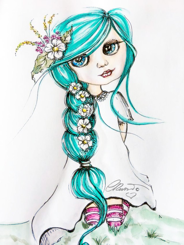 Stage 3 decisions and final touches: At this point I was at stage three I came back to my painting after being a part with it for several days! And I have decided to go on with the ink pen and doing some fine line work, I used Copic Multiliner pens with #0.1 and #0.03 tips this will leave the painting just more defined but still have a feeling of lightness. I also used touch of gold ink on the head-piece the thin branches of her crown are in gold ink and on the dress neckline there is a gold trim. I gave a touch of white ink just to give more contrast in her hair.