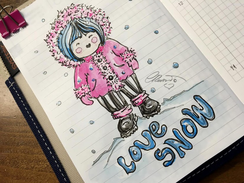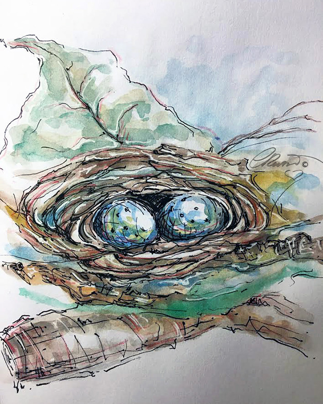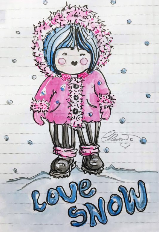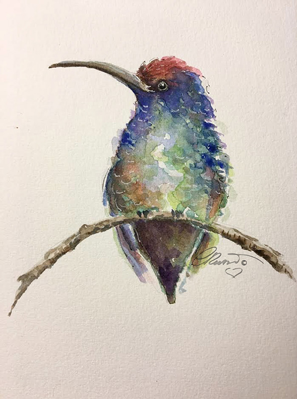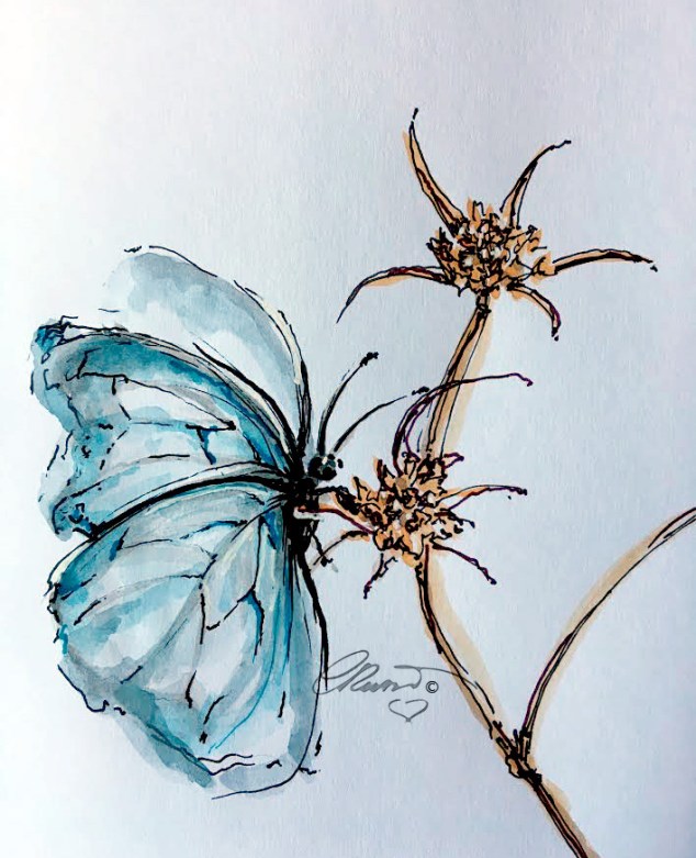 My watercolors usually are outlined with black and white ink pens. I used French Artists Watercolors Sennelier l’Aguarelle, Ink pens used COPIC Multiliner Black ink #01 and 0.03 . White and Gold Gelly Roll (Japan) pens. A Alvin Draft/Matic #03 Limited Edition Pink Mab Graves Pencil a THINEX Vintage Pencil Carmine Red 425T. Pentel Aqua Brush – I painted on Bee Paper for watercolor 140lb, 100% cotton, cold pressed, size 6×9 inches .