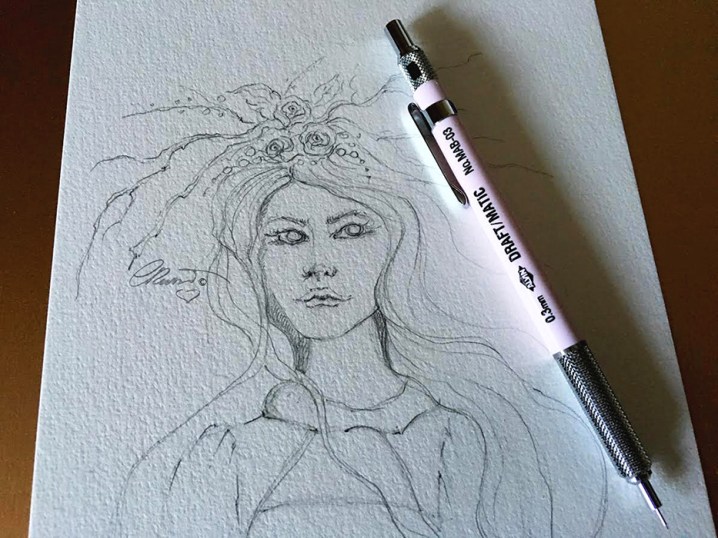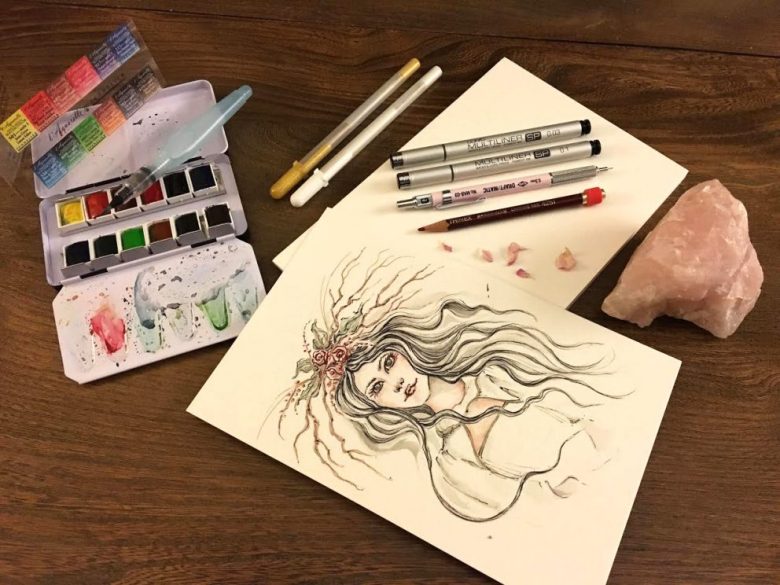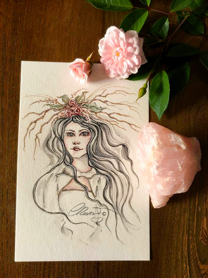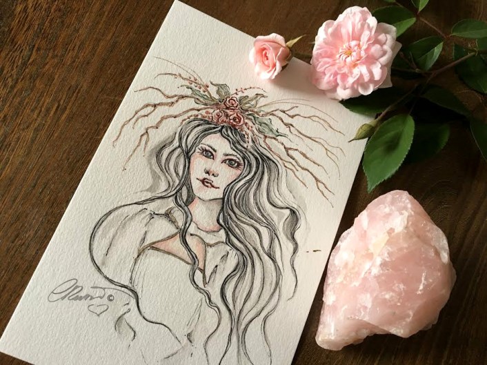 This is a good question! I actually draw or paint very often from my own imagination or from memories I have, I also love drawing from what I see around me. It depends of what I am drawing or creating. Sometimes I use reference photos if I am sketching something realistic or something that I never sketched before. To be precise on a realistic drawing I refer to images. But many times I paint straight with the watercolor on paper without even make a prior pencil sketch. I like to do that especially with flowers. I like to let the watercolor flow and create the shapes then guide of my brush. When I paint faces I prefer to make my pencil drawing first and then lay the watercolors. In “Forest Goddess” painting I made the drawing from my own imagination reference. I love to bring imaginary faces to life that’s how I made the pencil sketch that you see in the photo above. I haven’t used any reference photo for her face. Drawing faces without reference isn’t easy especially for beginners, you need to practice a lot and get familiar with face shapes, eyes, nose, lips, facial expressions, it takes time and practice to memorize and be able to create faces without photo references.