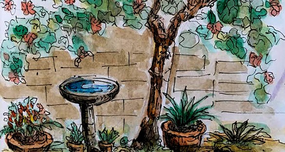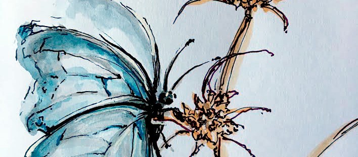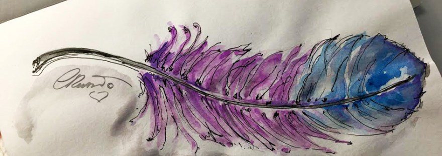 My watercolors usually are outlined with black and white ink pens. I used French Artists Watercolors Sennelier l’Aguarelle, Ink pens used COPIC Multiliner Black ink #01 and 0.03 . White and Gold Gelly Roll (Japan) pens. A Alvin Draft/Matic #03 Limited Edition Pink Mab Graves Pencil a THINEX Vintage Pencil Carmine Red 425T. Pentel Aqua Brush – I painted on Bee Paper for watercolor 140lb, 100% cotton, cold pressed, size 6×9 inches .