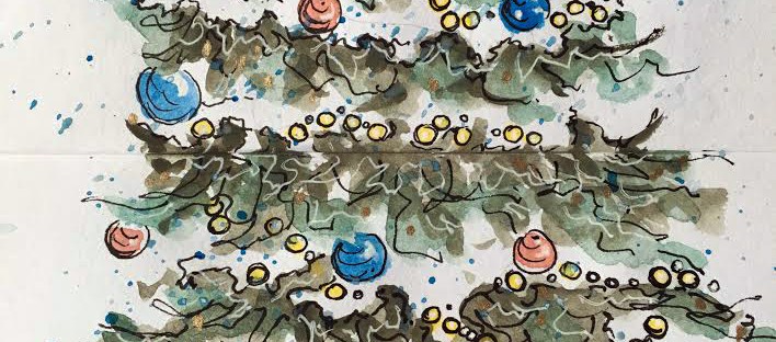 I loved to paint my Christmas Tree! To make it look beautiful and tall I had to open flat my tiny sketchbook and I painted on two pages it would be the center piece of my sketchbook since we are half way! In many parts of United States and in Europe it’s storm time with heavy snow and cold! Right now at the moment is 4.30pm here in California and today is raining it is not quite like a beautiful Christmas time snow 😉 but at least for the feeling I painted my tree in the snow!