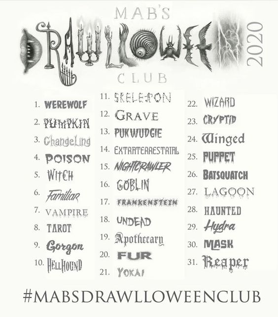 Settember 1st 2020 both challenges Official Prompt Lists were released on September 1st. Here there is also the MadsDrawlloweenClub2020 Prompt List artist Mab Graves list is always inspired and dedicated to the Halloween theme.