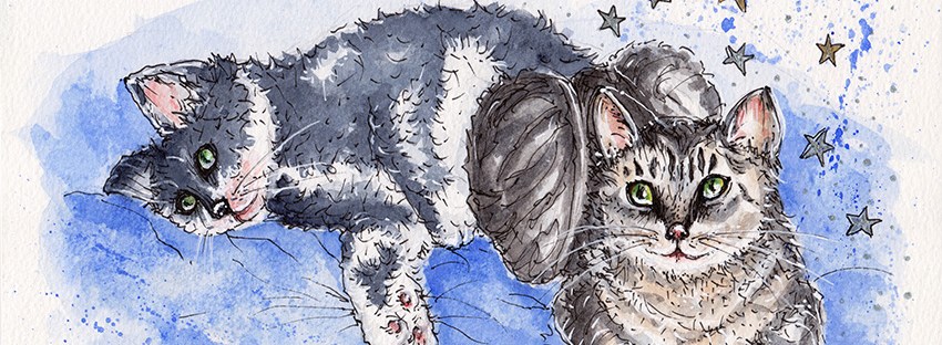 This is one of my latest commissions I have been working on. About a month ago I was kindly requested to create a “Pet’s Tribute Portrait”in loving memory of Tigger, the adorable gray Tabby cat you see in foreground of my painting. The sweet lady that contacted me is a follower Blogger Crystal she loves my art since last year she was the winner of one of my Giveaways. She requested this painting because this year on September 11th was the five years anniversary since Tigger crossed the rainbow bridge. Crystal followed my World watercolor month during the month of July and saw several animals I have painted. The Squirrel, the Owl, they lead her asking me if I do paint cats and of course I do! I said yes!